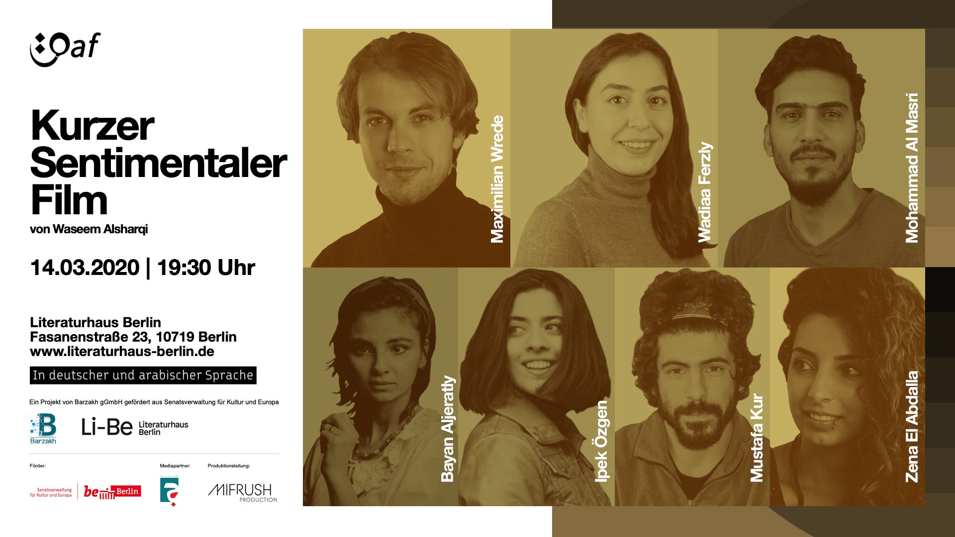 geboren 1989 in Damaskus, studierte Schauspiel am Hochinstitut für Dramatik. Er arbeitete in Fernseh- und Theaterproduktionen. Seit 2016 lebt er in Berlin und arbeitet als Schauspieler am Maxim Gorki Theater.